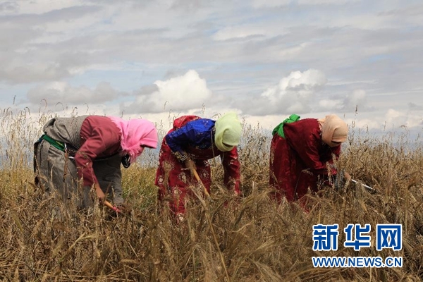 海南藏族自治州共和縣塘格木鎮(zhèn)吾赫勒村村民在收割青稞(9月26日攝)。 時(shí)下正值青海省海南藏族自治州青稞收獲季,當(dāng)?shù)剞r(nóng)民搶抓農(nóng)時(shí)進(jìn)行收割,田間一派繁忙景象。 新華社記者 趙玉和 攝
