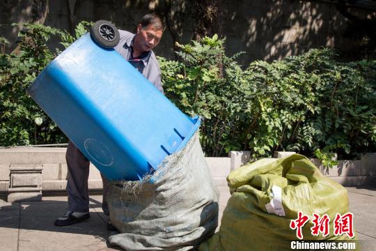徐道海將垃圾桶筒內(nèi)的垃圾裝入袋子。梅寧 攝