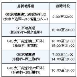 根據(jù)高德地圖交通大數(shù)據(jù)預(yù)測(cè) ,國(guó)慶節(jié)期間北京市返程易擁堵緩行的高速有G6京藏高速、G1京哈高速、G45大廣高速、G4京港澳高速等部分路段。