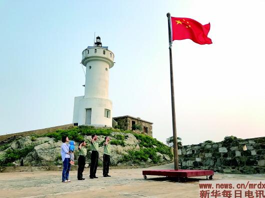 2017年9月12日,王志國(右一)一家與父母在開山島上向國旗敬禮。新華社發(fā)(謝明明攝)