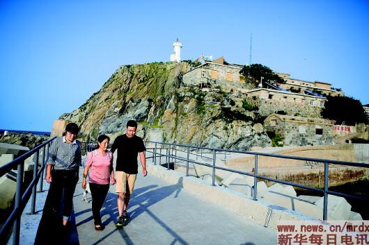 2018年8月8日,王志國(右)和母親王仕花(中)、姐姐王蘇(左)行走在開山島新修建的碼頭上。