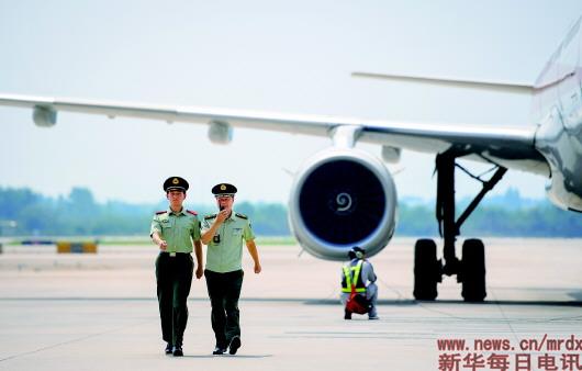 2018年8月7日,在南京祿口國際機場停機坪,王志國(右)進行例行巡查。