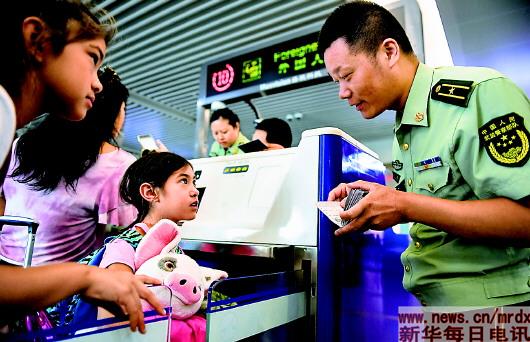 2018年8月7日,王志國(右)在南京祿口國際機場驗證臺外核實旅客證件。