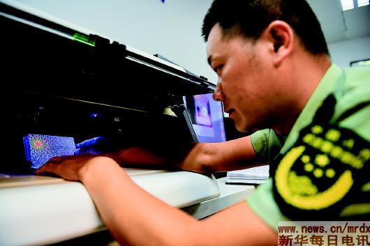 2018年8月7日,在位于南京祿口國際機場內(nèi)的南京邊防檢查站證件研究中心,王志國利用文檢設備進行證件研究。