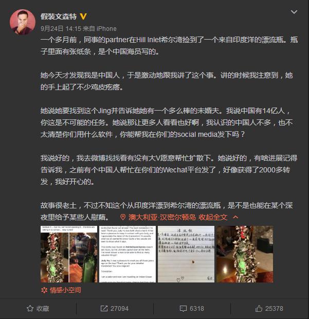 9月24日,知名旅游博主“假裝文森特”在微博發(fā)文稱,同事的伴侶凱特在澳大利亞的白天堂沙灘希爾灣撿到了一個來自印度洋的漂流瓶,瓶子里面有張紙條,是個中國船員寫的。信里道出了對未婚妻的無盡思念:“我是一名海員,現(xiàn)在正在印度洋上正在航行,心里很思念家中的未婚妻,剛訂婚不久我就出海了,心里感覺很對不起她,借著漂流瓶把心中的話寫出來。希望我回去以后,能跟晨靜和和美美,長長久久,其實呢,瓶子在深海中,也不奢侈有人能撿到打開,只是求一個心里的安慰。”因此,凱特非常希望能找到信中提到的未婚妻晨靜,告訴她她有一個多么棒的未婚夫。