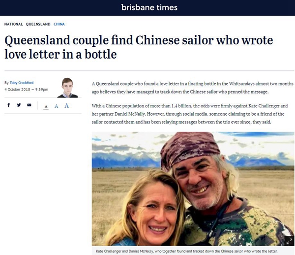 據(jù)英國廣播公司9月28日報道,近日,澳大利亞昆士蘭州一對夫婦在圣靈群島艾利海灘上發(fā)現(xiàn)一個被各種貝殼包裹的漂流瓶,瓶子里裝著一封信,但因為看不懂中文,便通過社交媒體尋求網(wǎng)民幫助。原來,這是一封中國船員寫給未婚妻的情書。信短情長,這對夫婦希望能找到中國海員的未婚妻。通過社交媒體等途徑,他們的尋人舉動吸引了不少網(wǎng)友的目光。有網(wǎng)友形容這封信“這么浪漫,都看哭了”,也有網(wǎng)友稱之為“發(fā)現(xiàn)自海洋的迷人故事”。然而,截至BBC發(fā)稿時,寫信的中國海員及其未婚妻都尚未找到。