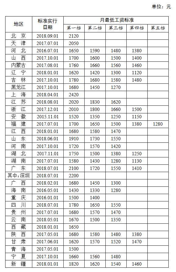 全國各地區(qū)月最低工資標準情況(截至2018年9月),來源人社部官網(wǎng)