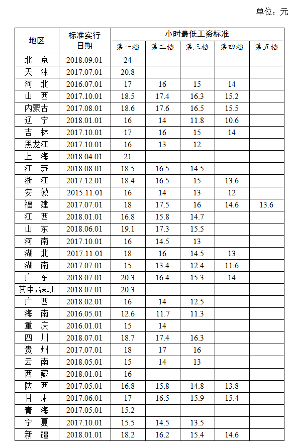全國各地區(qū)小時最低工資標準情況(截至2018年9月),來源人社部官網(wǎng)
