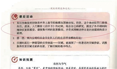 “通過這些要求旨在引導(dǎo)學(xué)生以實(shí)踐探索的方式,更好地了解張衡及地動(dòng)儀的相關(guān)知識(shí),體會(huì)中國(guó)古人的智慧,增強(qiáng)民族自豪感,提升學(xué)生綜合素質(zhì)。”人教社稱。
