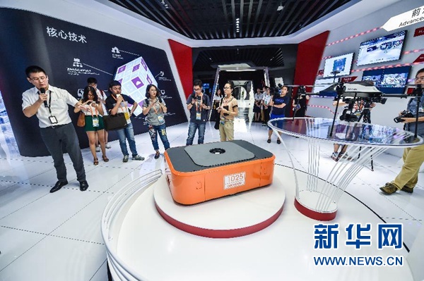 杭州海康威視數(shù)字技術(shù)股份有限公司工作人員向記者介紹公司研發(fā)的物流機器人(2016年9月2日攝)。新華社記者 徐昱 攝