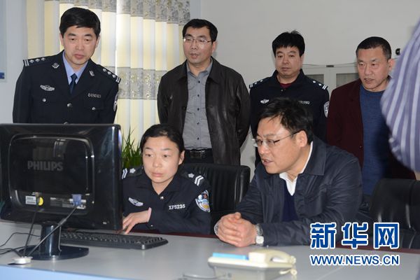 在河南省濮陽市范縣高碼頭鎮(zhèn),邵景良(前右)在調(diào)研綜治和平安建設(shè)工作(2016年3月3日攝)。 新華社發(fā)