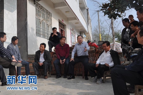 吳錦(左六)與群眾開“院子會(huì)”(2014年10月22日攝)。? 新華社發(fā)