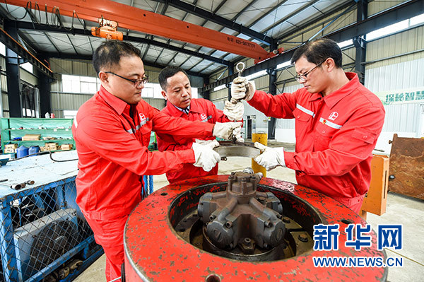 在中國石化江蘇油田工程技術(shù)服務(wù)中心,田明(中)與團(tuán)隊(duì)工作人員在保養(yǎng)設(shè)備(10月9日攝)。新華社記者 李博 攝