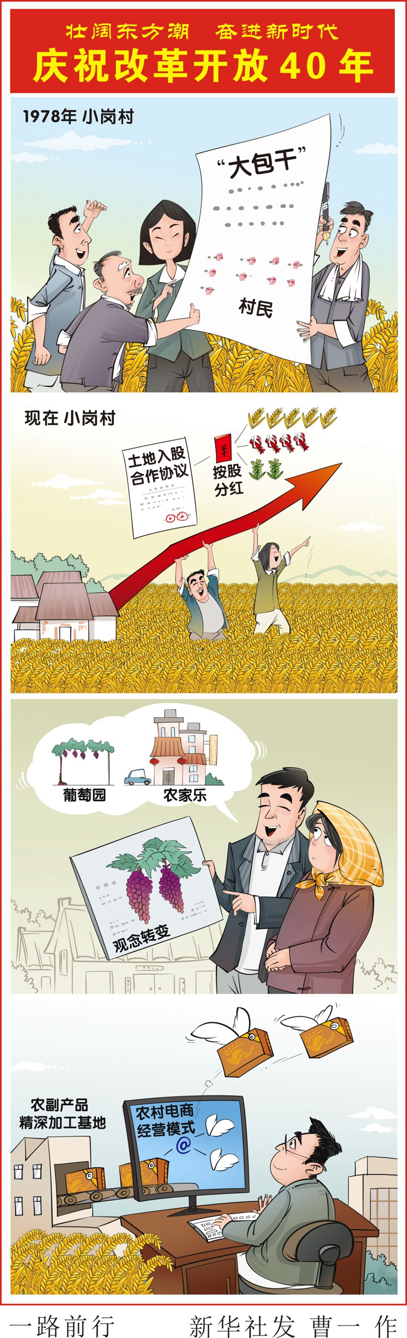 1978年的小崗村,18位村民按下了分田到戶的紅手印,“大包干”拉開了中國農(nóng)村改革的大幕。40年后的小崗村,正在開展農(nóng)村集體產(chǎn)權(quán)制度改革,土地入股讓農(nóng)民變股東;葡萄園里開起了農(nóng)家樂,對農(nóng)副產(chǎn)品進(jìn)行精深加工,電商經(jīng)營模式助力產(chǎn)品打開銷路,觀念的轉(zhuǎn)變讓小崗村里的農(nóng)民不再僅僅種著一畝三分地。