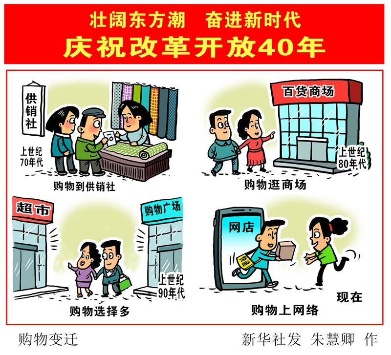 消費(fèi):上世紀(jì)70年代,購物到供銷社;上世紀(jì)80年代,購物逛商場;上世紀(jì)90年代,購物選擇多;如今,購物上網(wǎng)絡(luò)。↓↓