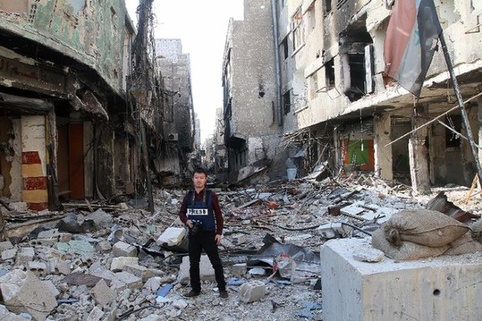 圖為陳聰在敘利亞戰(zhàn)場前線采訪。