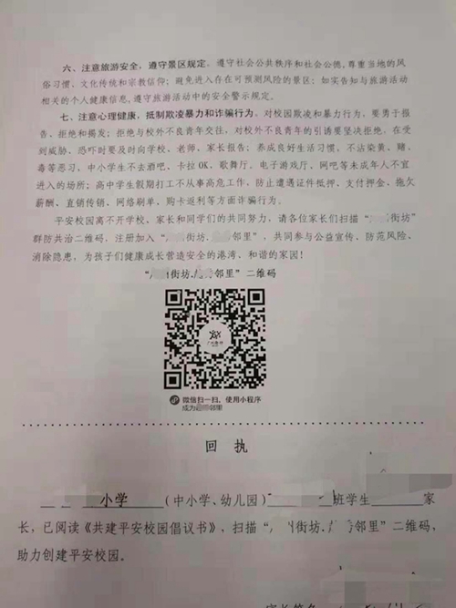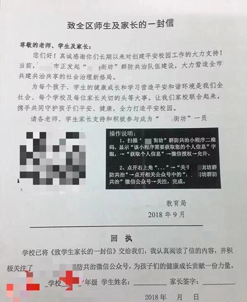 前不久,廣東某地發(fā)起“街坊群防共治隊(duì)伍建設(shè)”,并開設(shè)了微信公眾號(hào)。當(dāng)?shù)亟逃忠浴吨氯珔^(qū)師生及家長的一封信》的形式,要求師生和家長關(guān)注其公眾號(hào),并要求學(xué)生及家長簽名承諾“關(guān)注”。