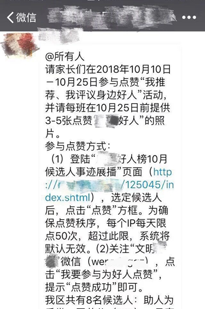 近日,廣東某所幼兒園的家長們又在群里收到老師發(fā)的通知:“請(qǐng)家長們?cè)?018年10月10日-10月25日參與點(diǎn)贊‘我推薦、我評(píng)議身邊好人’活動(dòng),并請(qǐng)每班在10月25日前提供3-5張點(diǎn)贊的照片。”