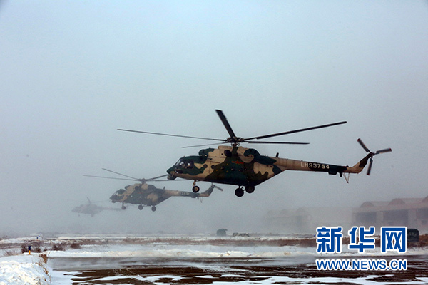 2018年1月5日,新疆軍區(qū)某陸航旅運輸直升機一營在嚴寒條件下組織飛行訓練。 新華社發(fā)(吳世科 攝)