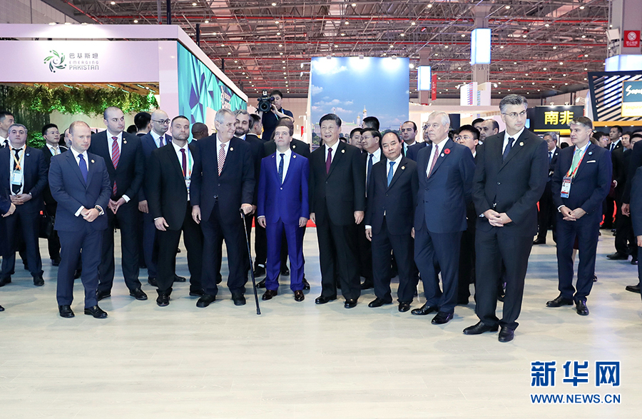 中午,習(xí)近平同外國(guó)領(lǐng)導(dǎo)人一同步入國(guó)家貿(mào)易投資綜合展展廳。他們邊走邊看,邊看邊談,先后參觀了匈牙利、埃及、英國(guó)、捷克、肯尼亞、薩爾瓦多、多米尼加、老撾、格魯吉亞、越南、巴基斯坦、俄羅斯等國(guó)展區(qū),了解各國(guó)經(jīng)貿(mào)發(fā)展成就和特色優(yōu)勢(shì)產(chǎn)品。習(xí)近平和各國(guó)領(lǐng)導(dǎo)人通過(guò)視頻欣賞了匈牙利的美麗風(fēng)光、領(lǐng)略了埃及的悠久文明和現(xiàn)代發(fā)展規(guī)劃,共同體驗(yàn)了英國(guó)館炫酷時(shí)尚的裸眼3D視頻。在捷克館,澤曼總統(tǒng)用捷克產(chǎn)鋼琴即興演奏一曲,并邀請(qǐng)習(xí)近平品嘗捷克啤酒。肯尼亞的鮮花、薩爾瓦多的咖啡、多米尼加的水果,琳瑯滿目的各國(guó)特色產(chǎn)品吸引中外領(lǐng)導(dǎo)人頻頻駐足。格魯吉亞總理和越南總理親自向習(xí)近平推介本國(guó)農(nóng)產(chǎn)品和旅游項(xiàng)目。老撾館的中老鐵路項(xiàng)目沙盤和巴基斯坦館的中巴經(jīng)濟(jì)走廊展板分別展現(xiàn)了中老、中巴共建“一帶一路”、實(shí)現(xiàn)共同發(fā)展的美好愿景。在俄羅斯館,習(xí)近平在梅德韋杰夫總理陪同下聽(tīng)取中俄在核電、天然氣、飛機(jī)制造、地方交往等領(lǐng)域合作成就介紹,共同展望中俄合作的廣闊前景。