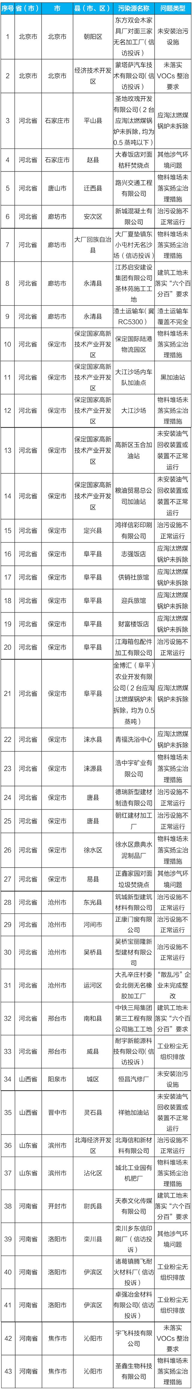 據(jù)生態(tài)環(huán)境部微信公眾號(hào)消息,11月9日,2018-2019年藍(lán)天保衛(wèi)戰(zhàn)重點(diǎn)區(qū)域強(qiáng)化監(jiān)督工作繼續(xù)開(kāi)展,發(fā)現(xiàn)涉氣環(huán)境問(wèn)題45個(gè)(其中2家企業(yè)各有2臺(tái)應(yīng)淘汰燃煤鍋爐未拆除),如下: