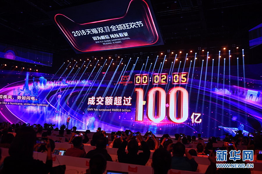 11月11日,在上海舉行的“2018天貓雙11全球狂歡夜”晚會上,阿里巴巴平臺的大屏顯示僅用了2分05秒阿里巴巴平臺上的成交額沖破100億元人民幣。新華社記者 黃宗治 攝?