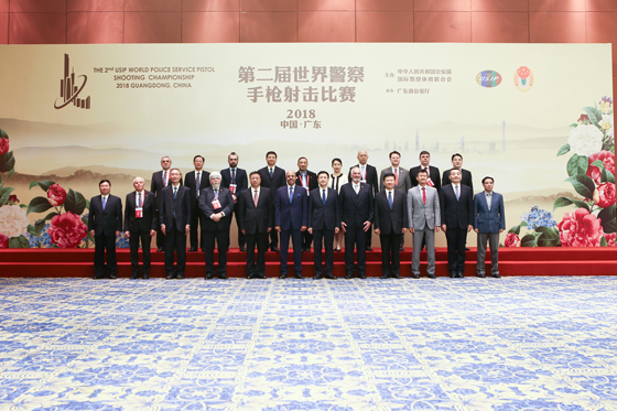 11月13日,公安部常務(wù)副部長(zhǎng)、第二屆世界警察手槍射擊比賽組委會(huì)名譽(yù)主席王小洪在廣州同來華出席比賽開幕式的國(guó)際警察體育聯(lián)合會(huì)和各國(guó)執(zhí)法部門官員合影。