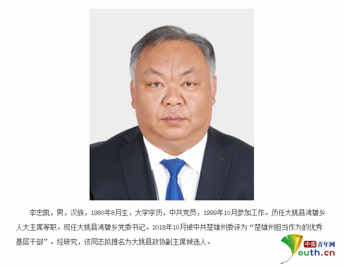公示稱,李忠凱大學(xué)學(xué)歷,中共黨員,1999年10月參加工作。歷任大姚縣灣碧鄉(xiāng)人大主席等職。2018年10月被中共楚雄州委評(píng)為“楚雄州擔(dān)當(dāng)作為的優(yōu)秀基層干部”。