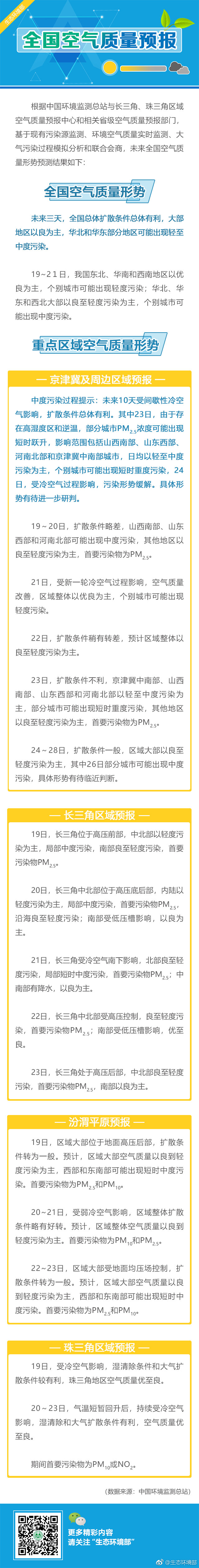據(jù)生態(tài)環(huán)境部官方微博消息,未來三天(11月19-21日),全國總體擴散條件總體有利,大部地區(qū)以良為主,華北和華東部分地區(qū)可能出現(xiàn)輕至中度污染。