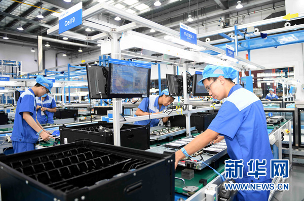 員工們在浪潮高端容錯計算機產(chǎn)業(yè)基地生產(chǎn)線上工作(6月14日攝)。 新華社記者 朱崢攝