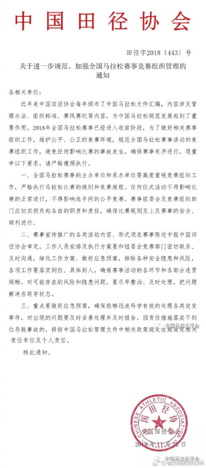 在這份名為《關(guān)于進(jìn)一步規(guī)范、加強(qiáng)全國馬拉松賽事競賽組織管理的通知》里,中國田徑協(xié)會指出,2018年全國馬拉松賽事已進(jìn)入收官階段,為維護(hù)公平、公正的競賽環(huán)境,規(guī)范全國馬拉松賽事活動的競賽組織工作,避免任何影響比賽的事故發(fā)生,確保賽事有序進(jìn)行,要求各相關(guān)單位嚴(yán)格遵照協(xié)會每年頒布的中國馬拉松文件匯編的各項要求,嚴(yán)格執(zhí)行馬拉松比賽的規(guī)則和競賽規(guī)程。任何儀式活動不得影響比賽的正常進(jìn)行,不得影響選手間的公平競賽。