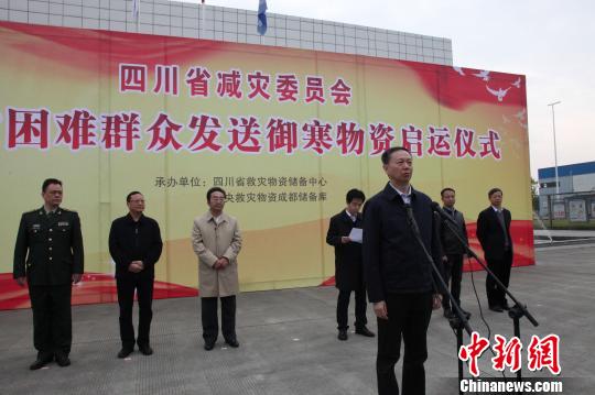 2018年冬向四川全省受災(zāi)困難群眾發(fā)送御寒物資啟運儀式,11月23日上午在四川省救災(zāi)物資儲備中心舉行。