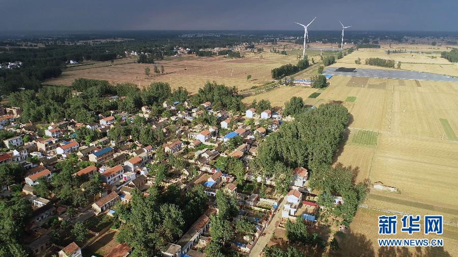 這是6月20日無人機拍攝的河南蘭考縣東壩頭鄉(xiāng)張莊村周圍的麥田和風機。 新華社記者 馮大鵬 攝