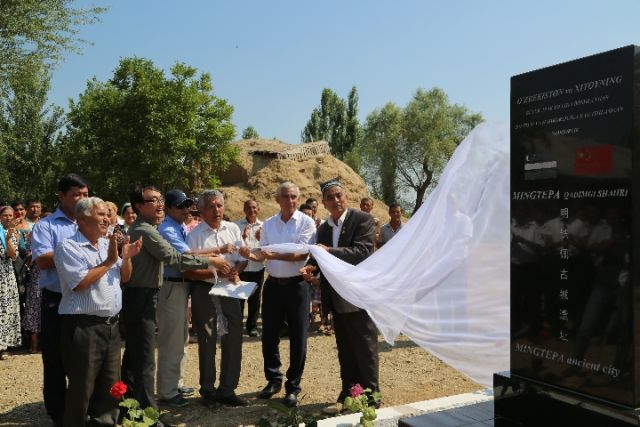2016年6月19日,中烏聯(lián)合發(fā)掘明鐵佩遺址的紀(jì)念碑揭牌。(中國(guó)社科院考古所供圖)