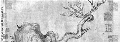 佳士得在宣傳材料中介紹,《木石圖》又稱《枯木怪石圖》,是蘇軾任徐州太守時前往蕭縣圣泉寺時所創(chuàng)作的一幅紙本墨筆畫。該畫作畫面內(nèi)容簡潔明了:一株枯木、一具怪石,怪石后有矮竹伸出。畫作裱成手卷,其后有題跋4首,包括同代著名畫家兼書法大師、與蘇軾同為“宋代四大書法名家”的米芾。畫卷另有鑒藏印共41枚。