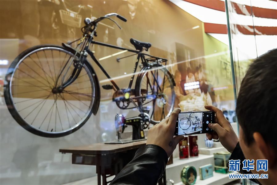 在“歷史巨變”展區(qū),一名參觀者在拍攝老式自行車和縫紉機(jī)。新華社記者沈伯韓 攝