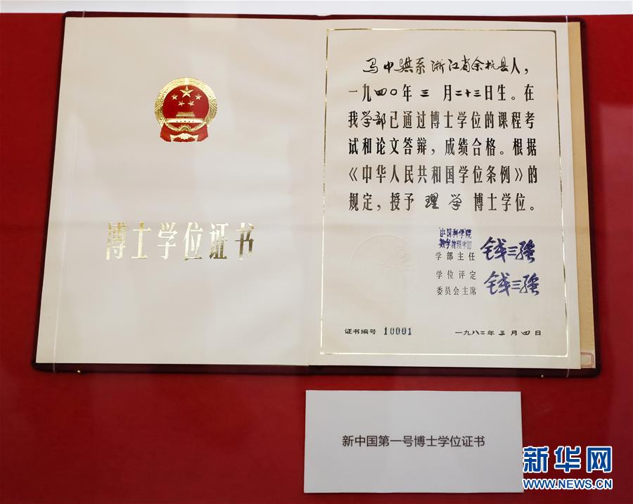 這是在“歷史巨變”展區(qū)拍攝的新中國第一號(hào)博士學(xué)位證書(11月15日攝)。新華社記者沈伯韓 攝