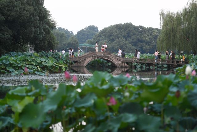 游客在杭州西湖曲院風(fēng)荷景區(qū)觀賞荷花 ( 黃宗治/攝 )