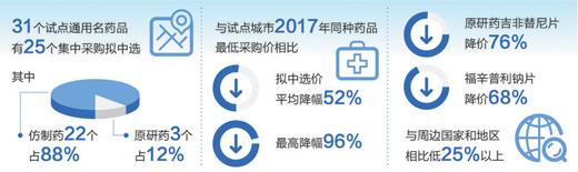 擬中選結(jié)果顯示,31個(gè)試點(diǎn)通用名藥品有25個(gè)集中采購擬中選,成功率81%。其中,通過一致性評價(jià)的仿制藥22個(gè),占88%,原研藥3個(gè),占12%。與試點(diǎn)城市去年同種藥品最低采購價(jià)相比,擬中選價(jià)平均降幅52%,最高降幅96%。原研藥吉非替尼片降價(jià)76%,福辛普利鈉片降價(jià)68%,與周邊國家和地區(qū)相比低25%以上。