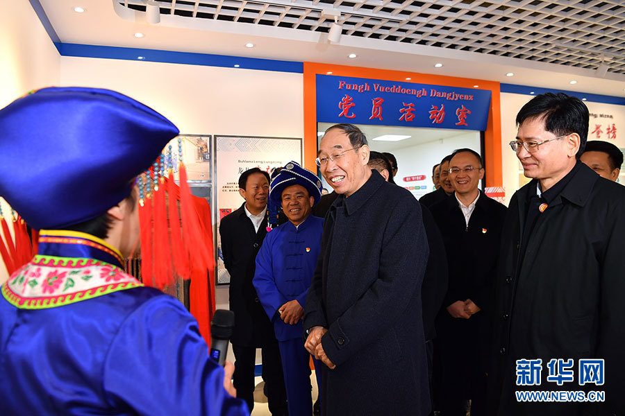 在港北區(qū)港城街道龍井村,尤權(quán)考察了村委辦公樓、便民服務(wù)大廳、壯族文化展館,聽(tīng)取民族團(tuán)結(jié)進(jìn)步創(chuàng)建等情況介紹,與少數(shù)民族群眾親切交談,祝愿他們?nèi)兆右惶毂纫惶旌?,生活越?lái)越幸福。
