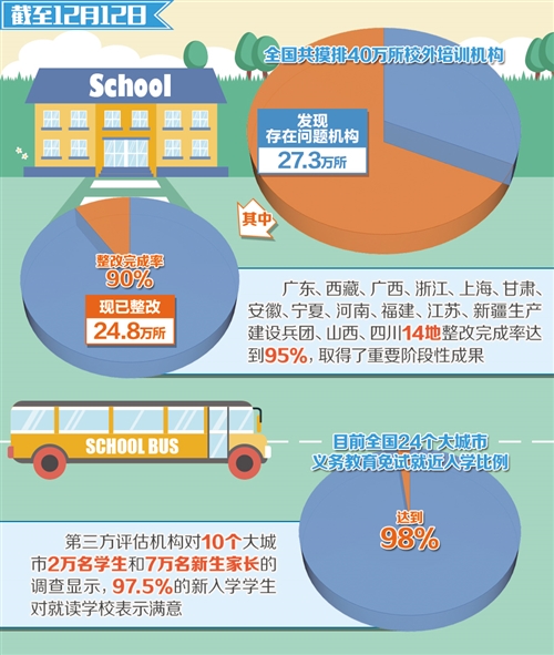校外培訓(xùn)專項整治工作開展半年多來,進(jìn)展比較順利。截至12月12日,全國共摸排40萬所校外培訓(xùn)機(jī)構(gòu),發(fā)現(xiàn)存在問題機(jī)構(gòu)27.3萬所,現(xiàn)已整改24.8萬所,整改完成率達(dá)到90%。廣東、西藏、廣西、浙江、上海、甘肅、安徽、寧夏、河南、福建、江蘇、新疆生產(chǎn)建設(shè)兵團(tuán)、山西、四川等14地整改完成率達(dá)到95%,取得了重要階段性成果。