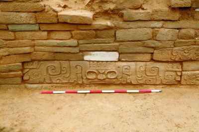 皇城臺為一處四圍包砌石砌護(hù)墻的高阜臺地,位于內(nèi)城中部偏西?;食桥_臺頂?shù)囊恍┐笮徒ㄖ湓谝惶幋笮团_基上。2018年,從這處大臺基南護(hù)墻倒塌的墻體石塊內(nèi),考古隊出土了30余件石雕作品,有一些石雕還鑲嵌在南護(hù)墻墻面上。這些石雕絕大多數(shù)是雕刻于石塊一面的單面雕刻,有符號、人面、神面、動物、神獸等,有一些畫面長度近3米,以中心正臉的神面為中心,兩側(cè)對稱雕出動物和側(cè)臉人面,體現(xiàn)出成熟的藝術(shù)構(gòu)思和精湛的雕刻技藝。