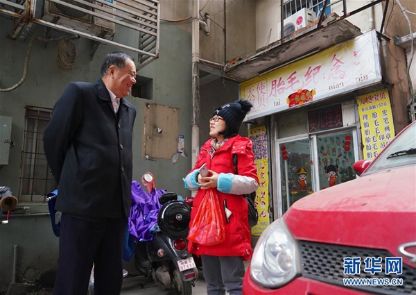 12月24日,邱娥國(guó)(左)在南昌市象山社區(qū)向一位百姓了解社區(qū)的最新情況。 新華社記者 胡晨歡 攝