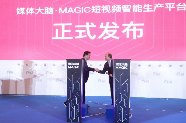 12月27日,在成都世紀(jì)城國際會(huì)議中心,新華社副社長、黨組成員劉思揚(yáng)(右)和阿里巴巴集團(tuán)黨委書記、秘書長邵曉鋒共同出席 “媒體大腦·MAGIC短視頻智能生產(chǎn)平臺(tái)”發(fā)布。