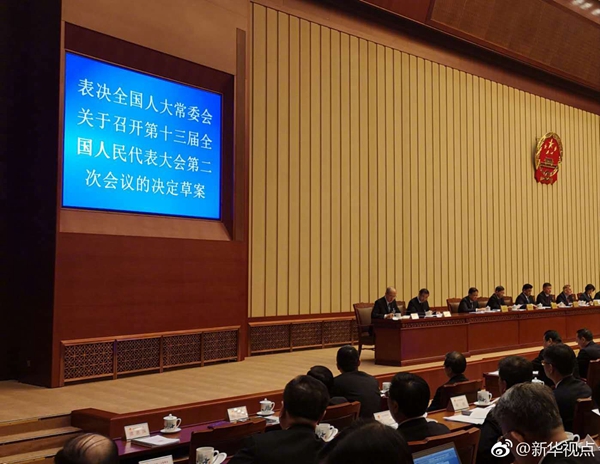 十三屆全國(guó)人大常委會(huì)第七次會(huì)議29日表決通過了關(guān)于召開十三屆全國(guó)人大二次會(huì)議的決定。根據(jù)決定,十三屆全國(guó)人大二次會(huì)議將于2019年3月5日在京召開。
