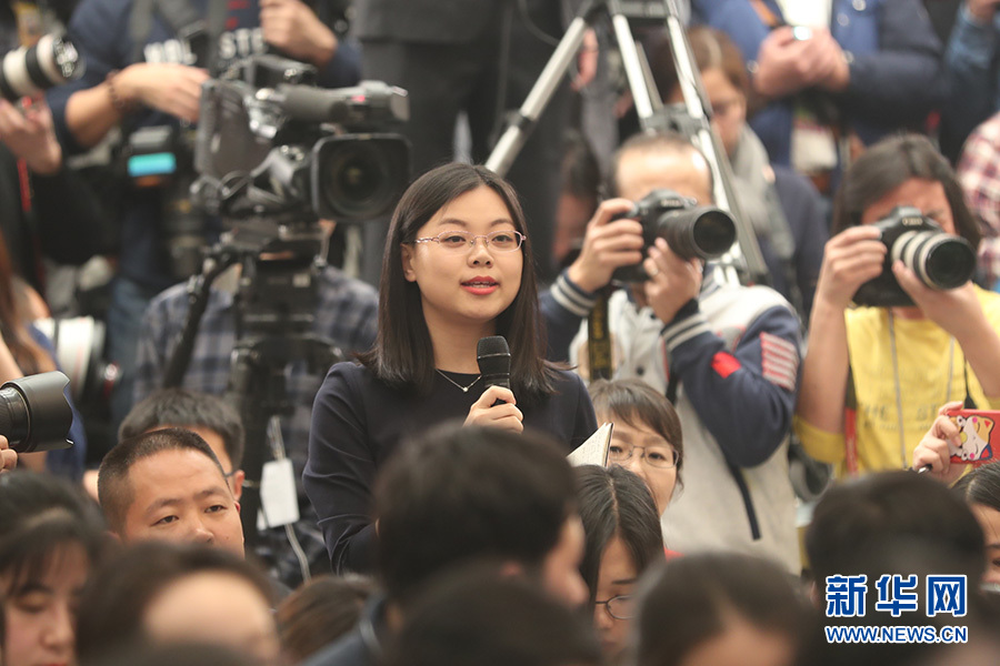 全國政協十三屆一次會議新聞發(fā)布會3月2日16:30在人民大會堂一層新聞發(fā)布廳召開,大會新聞發(fā)言人王國慶向中外媒體介紹本次大會有關情況并回答記者提問。圖為光明日報記者提問。新華網/中國政府網 曲植 攝