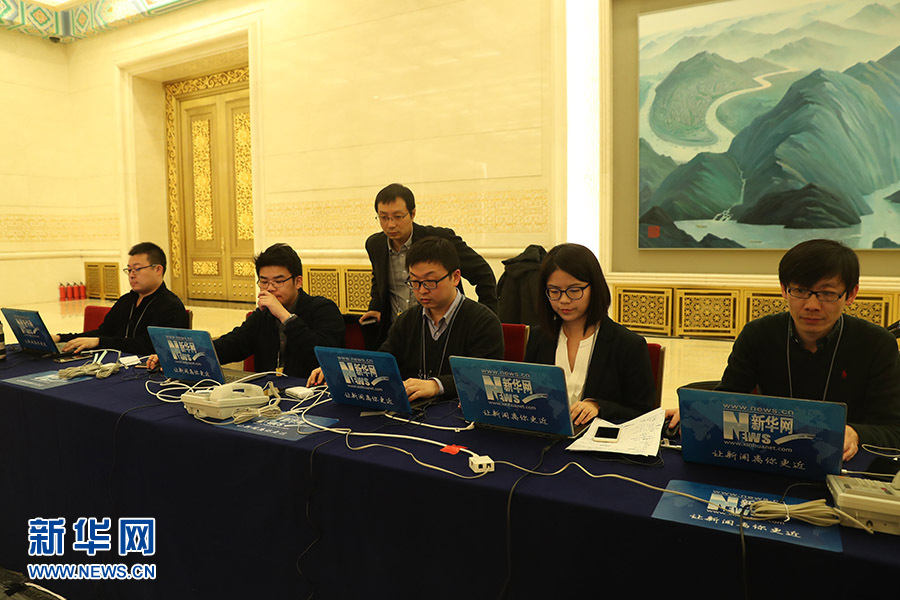 民主黨派中央和全國工商聯(lián)領導人記者會3月6日下午在人民大會堂金色大廳舉行,邀請民革中央主席萬鄂湘、民盟中央主席丁仲禮、民建中央主席郝明金、民進中央主席蔡達峰、農(nóng)工黨中央主席陳竺、致公黨中央主席萬鋼、九三學社中央主席武維華、臺盟中央主席蘇輝、全國工商聯(lián)主席高云龍回答記者提問。圖為現(xiàn)場直播團隊正在進行準備工作。新華網(wǎng)/中國政府網(wǎng) 陳杰 攝