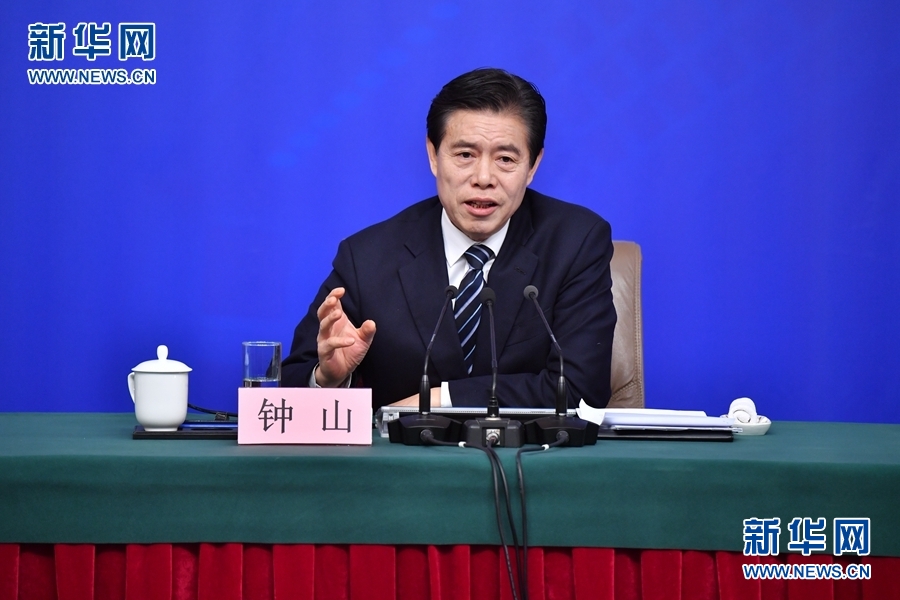 3月11日,十三屆全國(guó)人大一次會(huì)議新聞中心舉行記者會(huì),邀請(qǐng)商務(wù)部部長(zhǎng)鐘山、副部長(zhǎng)兼國(guó)際貿(mào)易談判副代表王受文、副部長(zhǎng)錢(qián)克明就“推動(dòng)形成全面開(kāi)放新格局推動(dòng)商務(wù)事業(yè)高質(zhì)量發(fā)展”相關(guān)問(wèn)題回答中外記者提問(wèn)。這是鐘山在回答記者提問(wèn)。 新華社記者 李鑫 攝