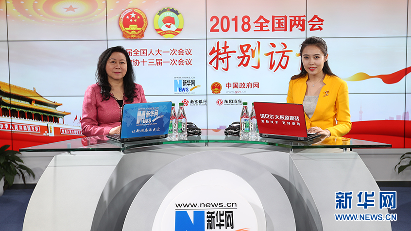 圖為全國政協(xié)委員、新大陸科技集團總裁王晶做客新華網(wǎng)2018全國兩會特別訪談 新華網(wǎng)郭小天攝