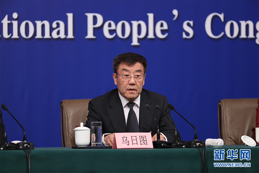 3月12日,十三屆全國人大一次會議新聞中心在梅地亞中心多功能廳舉行記者會,邀請十二屆全國人大內(nèi)司委副主任委員王勝明、財(cái)經(jīng)委副主任委員烏日圖、教科文衛(wèi)委副主任委員吳恒、環(huán)資委委員呂彩霞,全國人大常委會法工委副主任王超英、副主任許安標(biāo)就“人大立法工作”相關(guān)問題回答中外記者提問。圖為財(cái)經(jīng)委副主任委員烏日圖回答記者提問。新華網(wǎng)/中國政府網(wǎng) 翟子赫 攝